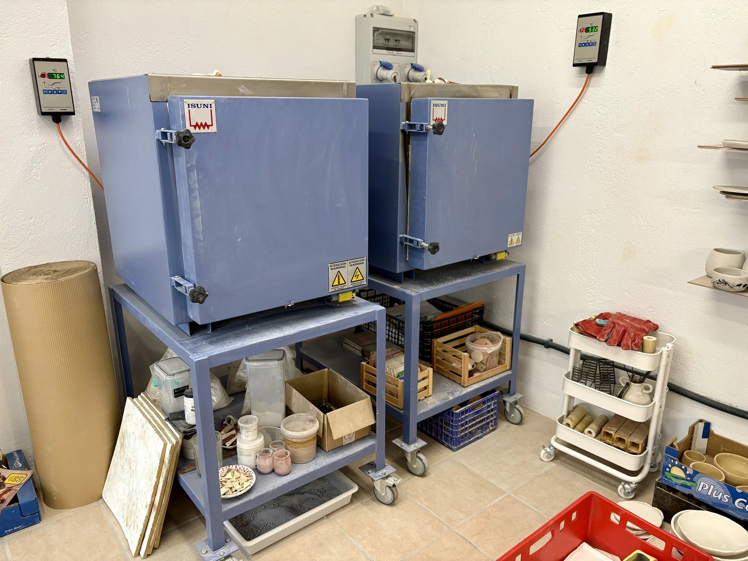 Si tens peces que necessites coure, també oferim servei de lloguer de forns. Al taller hi ha dos forns d’alta temperatura, amb un espai interior de 44,2cm d’ample, 44,6cm de profunditat i 45,6cm d’alt. Es pot llogar el forn sencer o compartir-lo amb altres peces, pagant la part proporcional ocupada del forn.